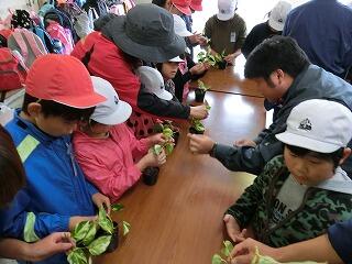 宮尾野農場では、高千穂高校生の案内で施設見学をしたり、ポトスの苗の植え付けをしたりしました。