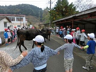 高千穂高校で飼育されている牛はとてもおとなしく、みんなで手をつないだ囲いに追い込んだり、実際にさわったりすることができました。