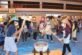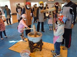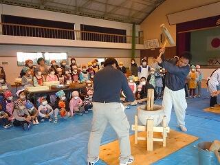 保護者や地域の方に協力していただき、全校でもちつき大会を行いました。