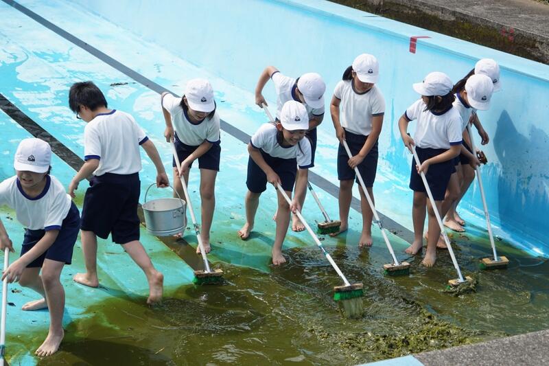 泥や藻で汚れていたプールを心を込めてぴかぴかにしました。今年も安全に気をつけて楽しく水泳の授業を行います。来週がプール開きです。