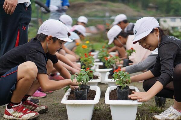 学校で種から育てた花の苗をプランターに植えたり、花壇に植えたりしました。