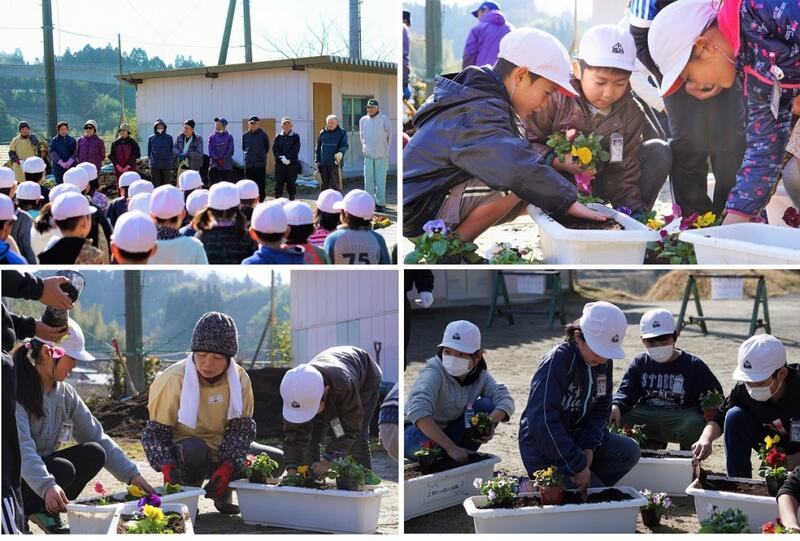 今日は老人クラブの方々に協力していただいて、全校でプランターと花壇に花の苗を植えました。老人クラブの方々のおかげでスムーズに花植えをすることができました。