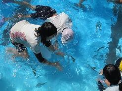 プールに放流した魚を子供たちが追いかけ、自分の手でつかみ取りをする流れです。