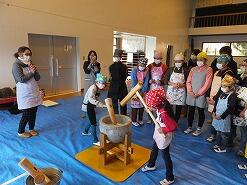 もちつき大会では、まず地域の方にもちつきの実演をしてもらい、その後に児童が二人組でもちつきに挑戦しました。重い杵を振り上げるのが大変そうでしたが、全員がもちを一生懸命つくことができました。もちをついた後は、自分の分のもちを丸めて、給食の時間に豚汁といっしょに美味しくいただきました。
