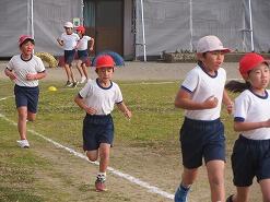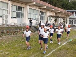 午前9時頃から始まりましたが、児童は寒さに負けず、半袖と短パンで元気よく活動しました。1・2年生が800m、3・4年生が1000m、5・6年生が1200mを走り、全員が完走しました。