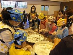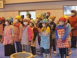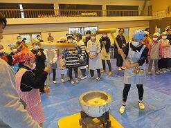 児童は3班に分かれて餅つきや餅丸めに挑戦し、自分で丸めた餅を給食の豚汁とともにいただきました。臼や杵を使った本格的な餅つきは、今ではとても珍しく、教育課程の中に組み入れている学校も大変少くなりました。