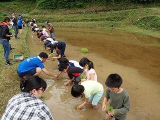 6月12日(金)田植えを行いました。梅雨入りして約2週間、苗の生育もよく、心配されていた天気も雨に降られることもなく、田主の佐藤様、JAの皆様、PTA会員の皆様の御協力により田植えを終えることができました。