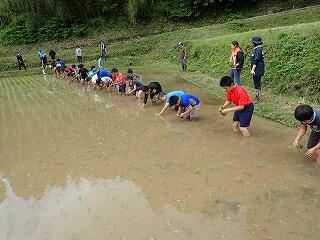 例年ですと、初めて田植えを経験する1年生を6年生がサポートするのですが、本年度は新型コロナウイルス感染症予防対策として、下学年と上学年の時間を分けて、3密をさける形を取りました。1年生は、田の感触を楽しみながら上手に植えることができました。また、さすが6年生、あっという間に手際よく残りを仕上げてくれました。秋の収穫がとても楽しみです。