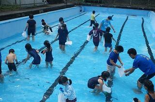 8月25日(火)、登校日の午後に魚つかみ大会を、田原地区漁協の皆様の御協力のもと学校のプールで行いました。