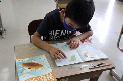 7月のある日、1年生が、国語の学習で図書室にいました。