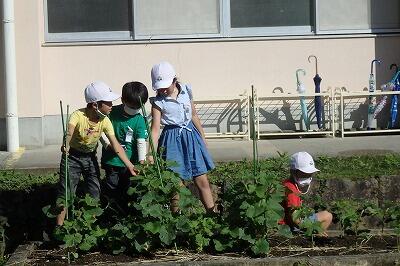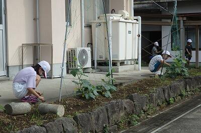 1年生と2年生が、キュウリの観察をしながら、草抜きをしています。