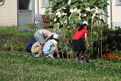 3年生が、学級園の花の生長を確認しながら、草を抜いています。