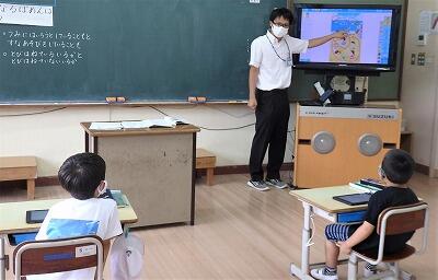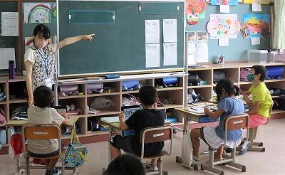 2・3年生は、算数の授業を複式で行っています。学習内容を説明しています。