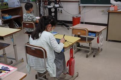 7月のある日、1年生が、国語の学習で図書室にいました。