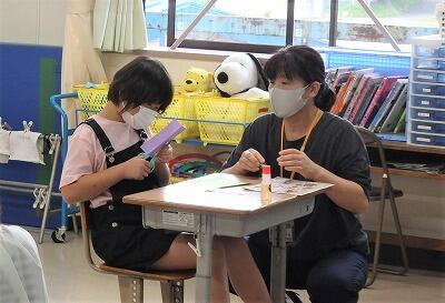 支援員の先生が見守る中、はさみを上手に使って「かざり」を作成中…。