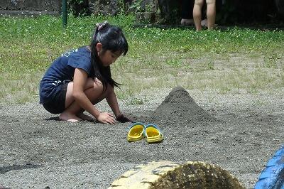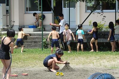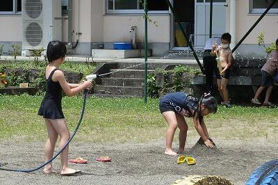 水や砂を使って、夏の遊びを活動しながら楽しんでいます。