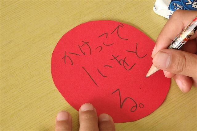 赤や白の丸い札に何かを書いています…。