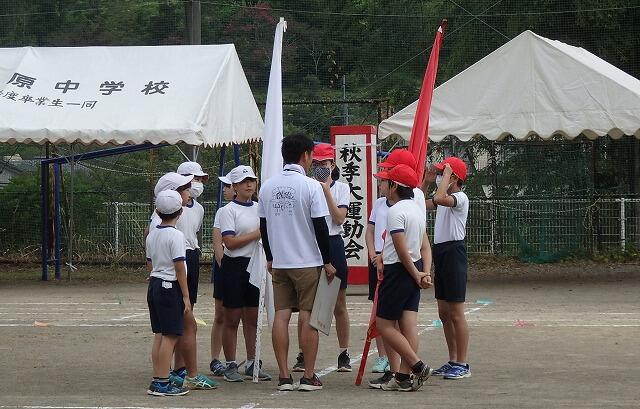 赤団と白団が、自分の団の位置に移動し、いよいよ競技開始です。どちらも、気合い十分です。