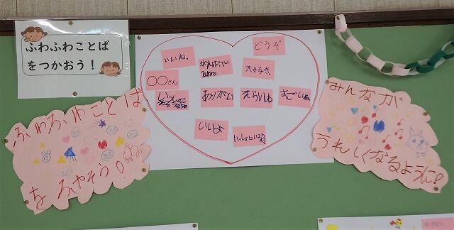 教室の後ろには、すてきな「ふわふわことば」がたくさん示されています。