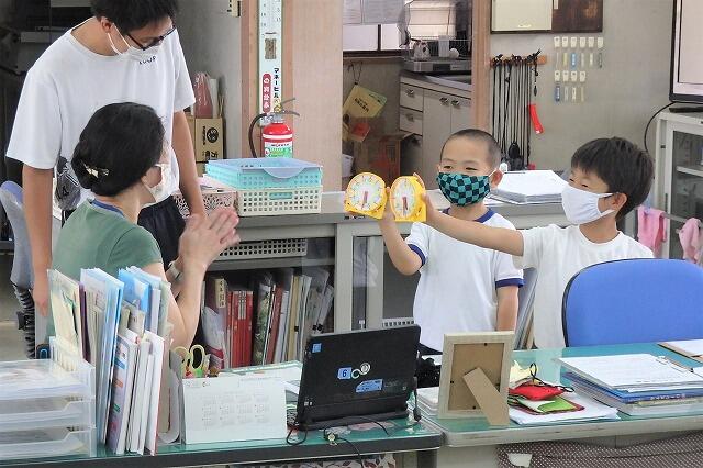 職員室でも、先生が起きた時刻を「ピタリ賞」。時刻合わせに自信が出てきました。