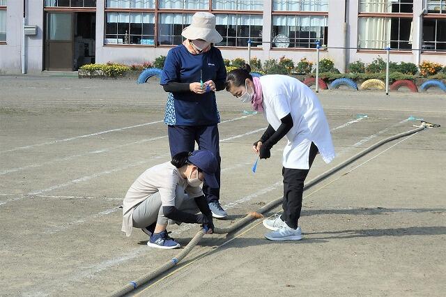 先生たちが、綱引きの際、間隔をとって「密」を防ぐために、3種類の色テープを貼りました。