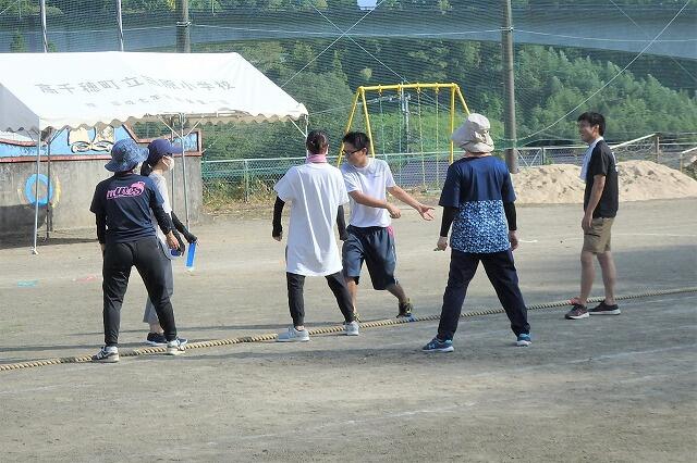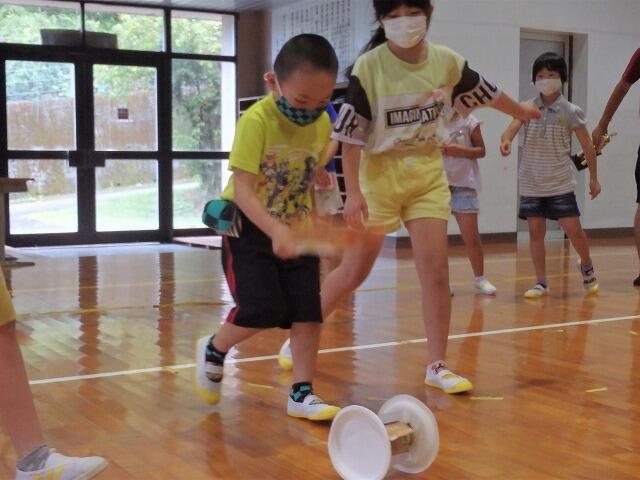 テープを貼った場所に着いて、イメージ綱引きにチャレンジ !! 間隔がしっかりとれています。