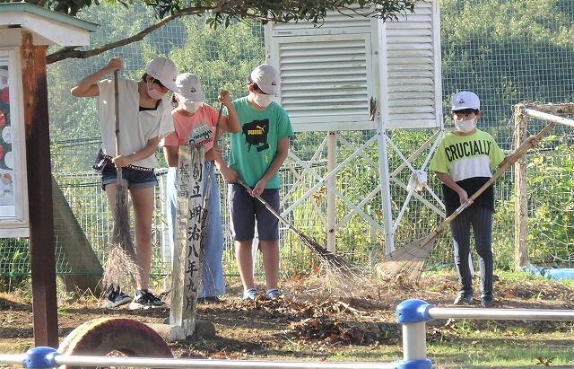 田原っ子たちは、朝のボランティアで落ち葉の掃除や運動場の草抜きなどをしています。