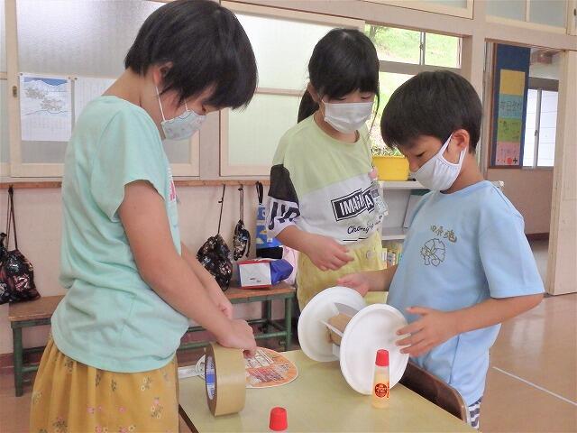 目線の先は、紙皿を組み合わせたもの。回るのかな… ?!