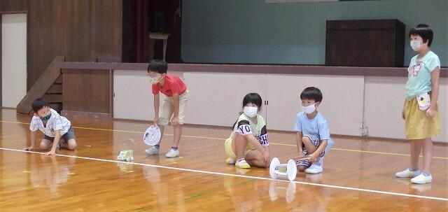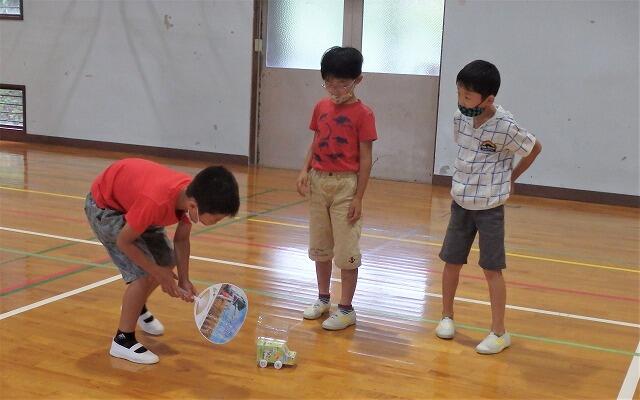 うちわで扇いで、風を起こしています。 風で動くおもちゃの競走「風リンピック」です。