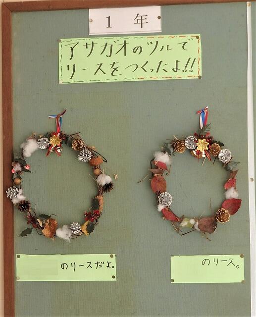1年生は、「あさがおのつる」や「落ち葉」「松ぼっくり」などで、リースを作りました。
