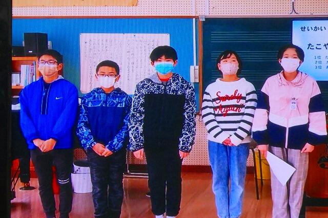 「給食感謝ビデオ」をに出演した、保健・体育委員会の5年生と6年生です。