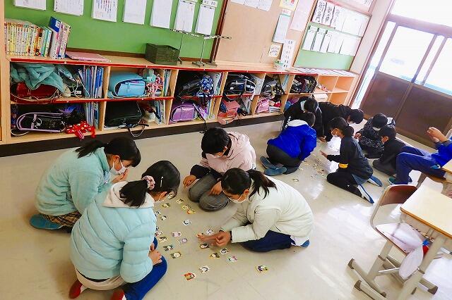 歴史上の人物に関するカルタです。読み手が人物にちなんだ行動を読んで、児童が札を取ります。