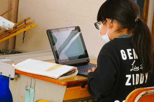 教材文で読み取った内容をタブレットに入力しています。その際、ローマ字を活用して入力することを条件としたことで、ローマ字の定着と入力技能の向上を目指しました。