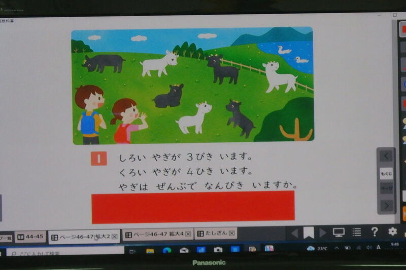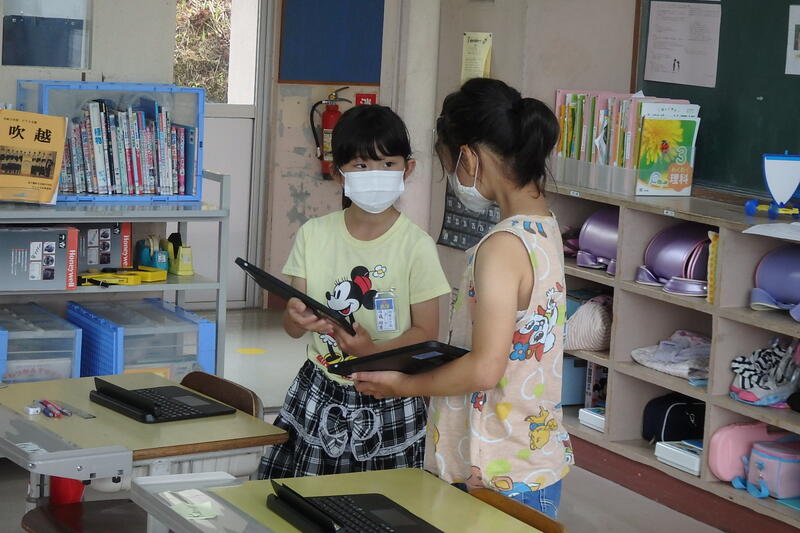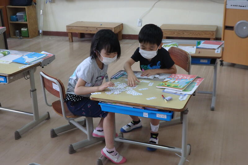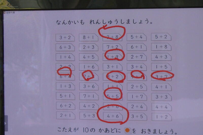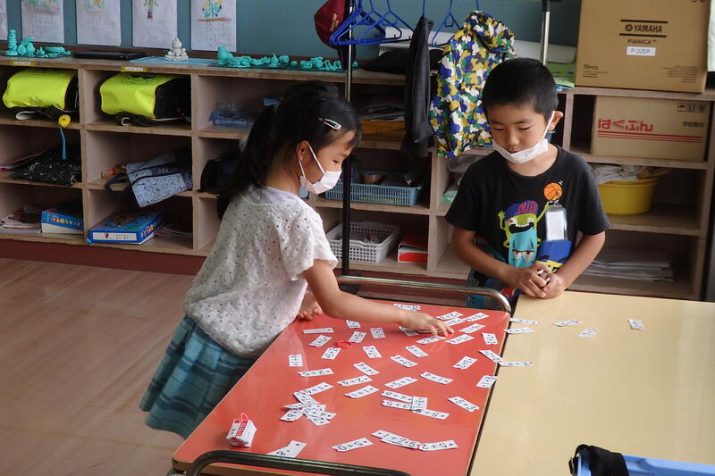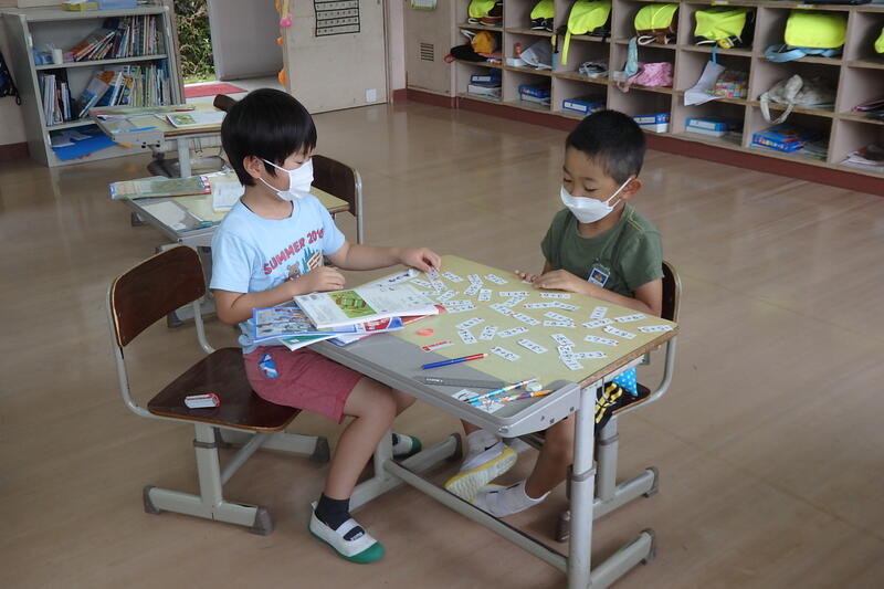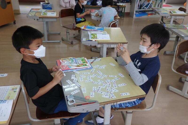 1年生が、ペアで計算カードをつかった学習に取り組んでいます。