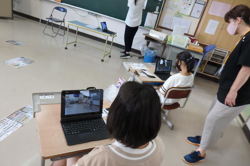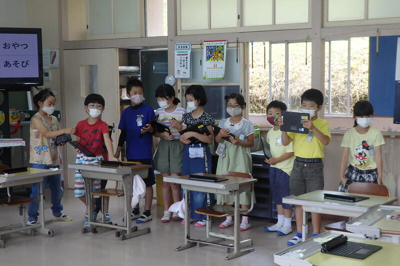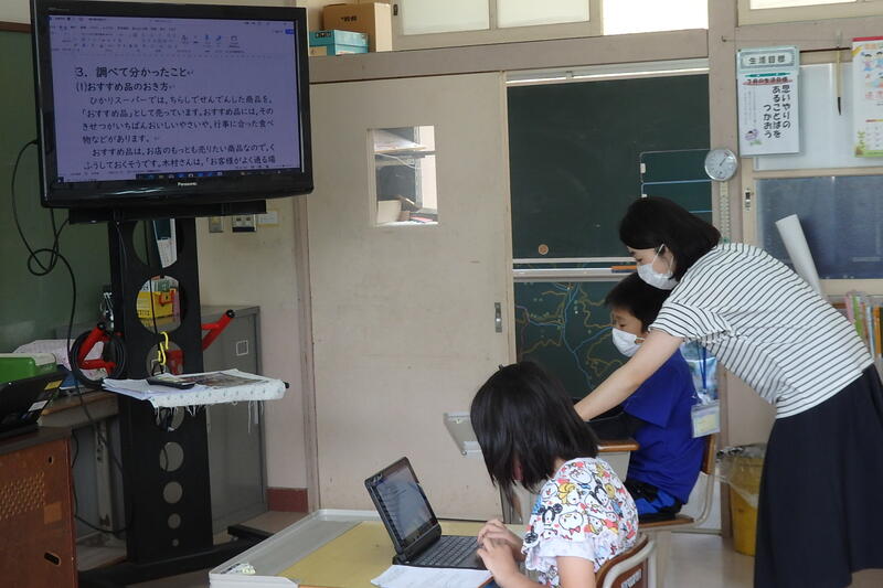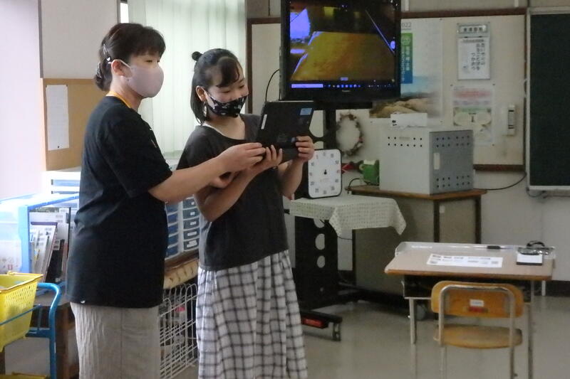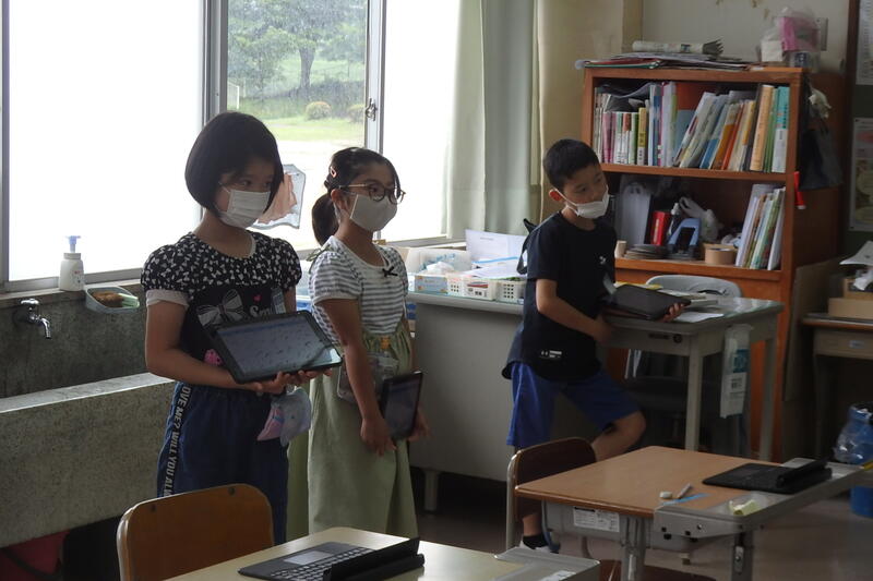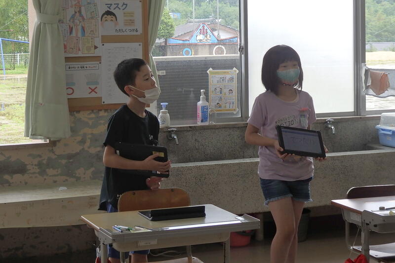 タブレットに保存している児童の作品を見ながら、1学期の学習を確認していただきました。