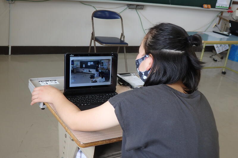 前の時間に発表した自分の録音データをイヤホンで確認します。