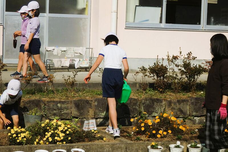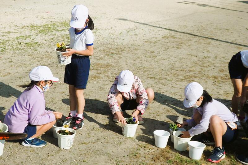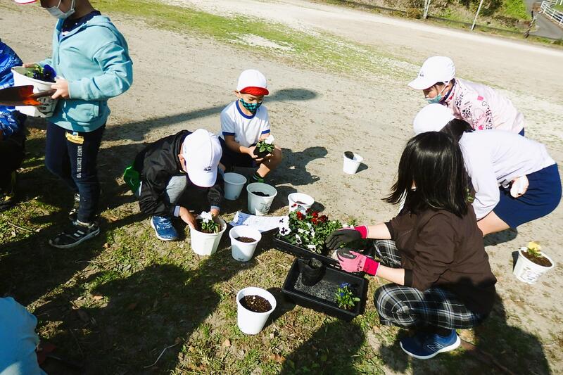 1年生から3年生が、植木鉢に花の苗を移植しました。