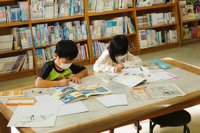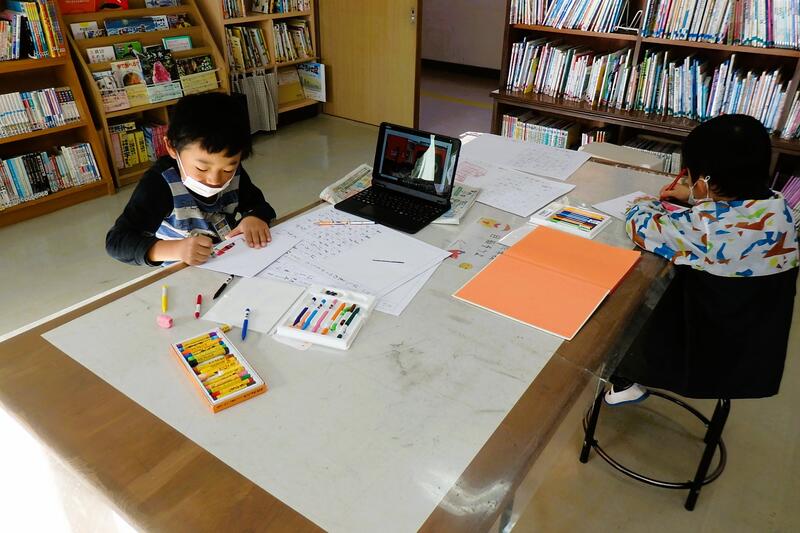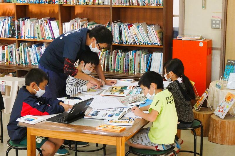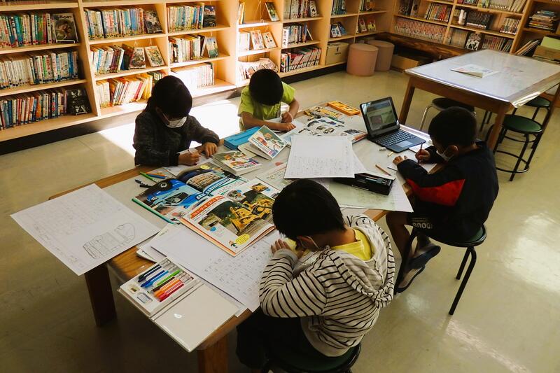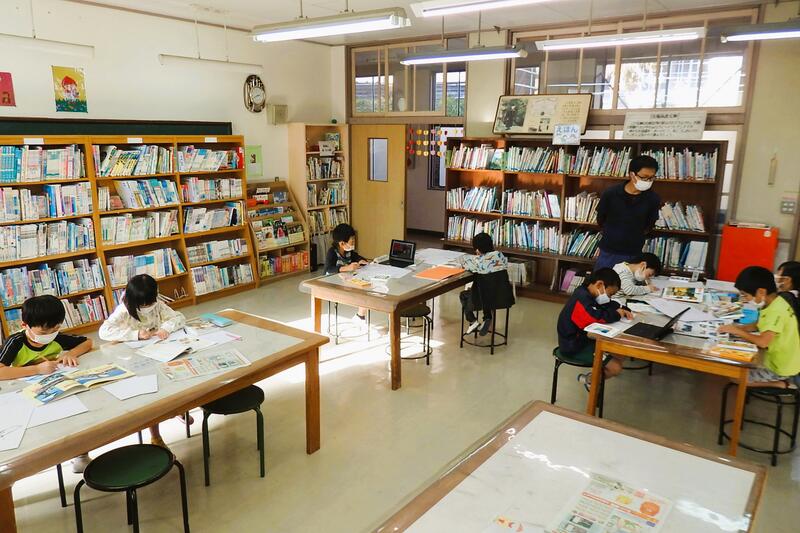 1年生が、図書室の図鑑を使って調べています。