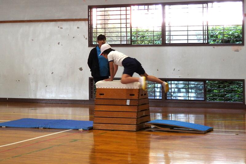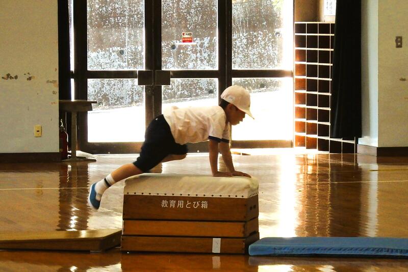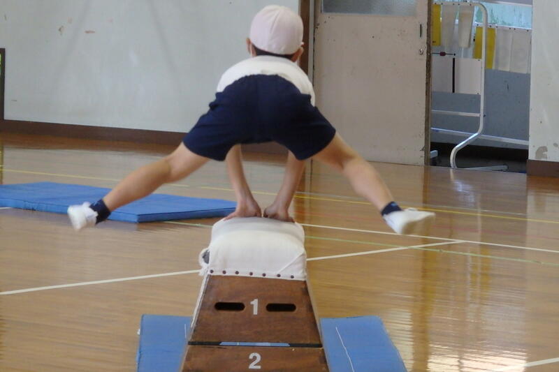 跳び乗りや跳び下り、手をついてのまたぎ乗りやまたぎ下りをすることをねらいとしていますが、田原っ子は、跳び越しています。