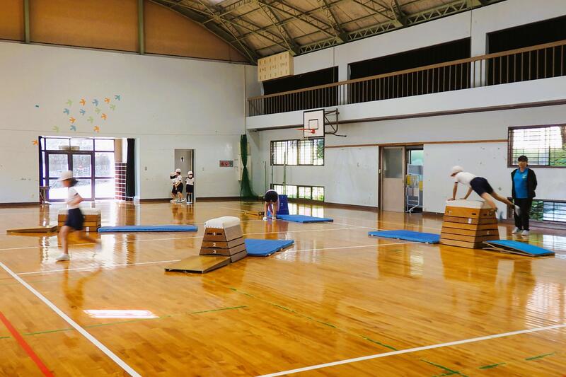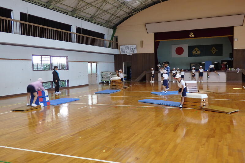 1・2年生が、跳び箱を使った運動遊びをしています。