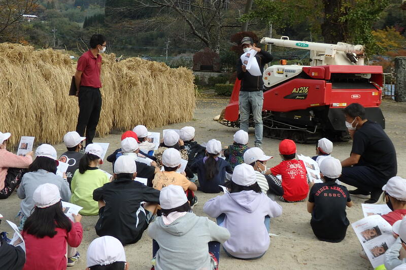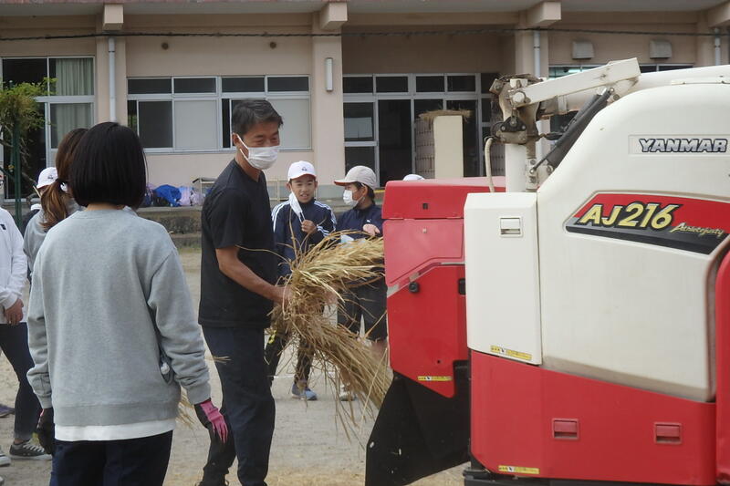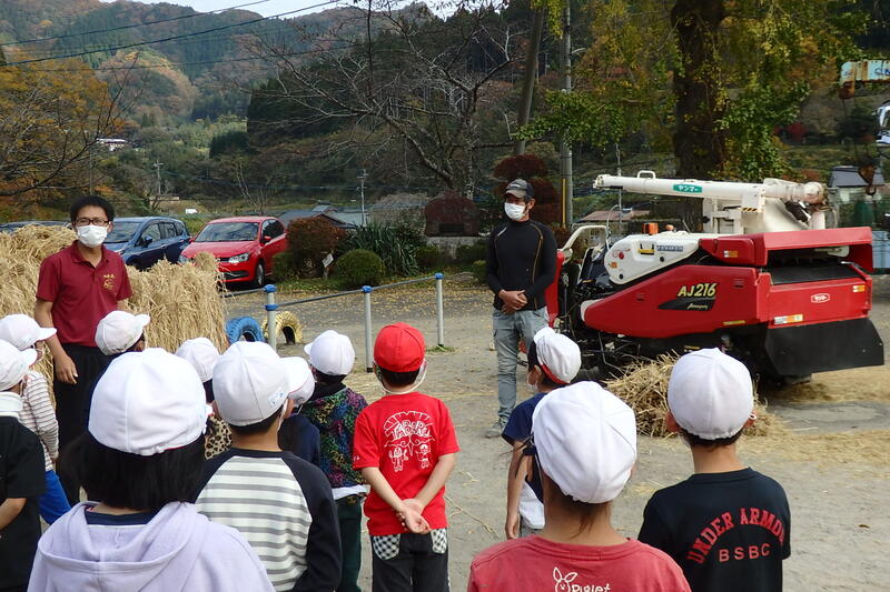 PTA会長が、コンバインを学校に持ってきてくださいました。