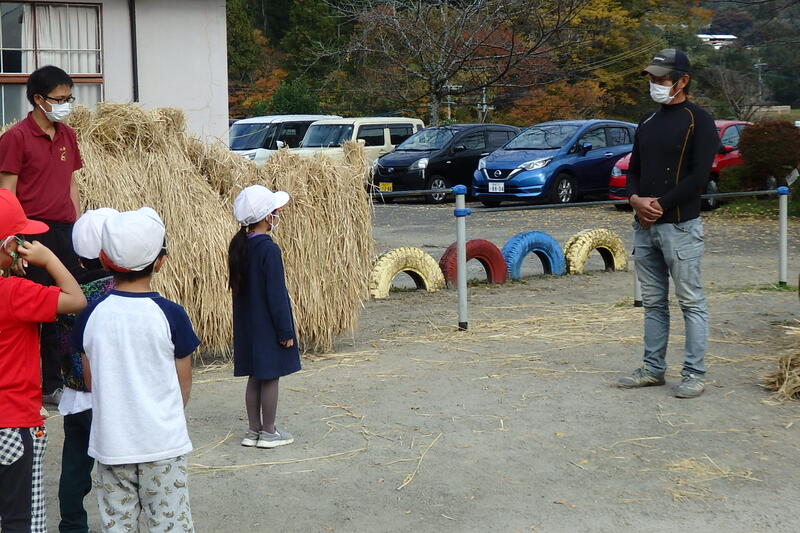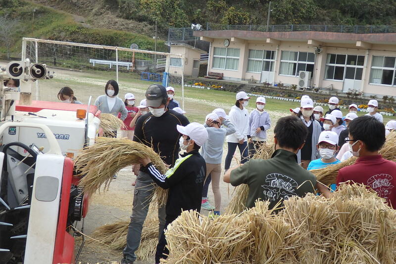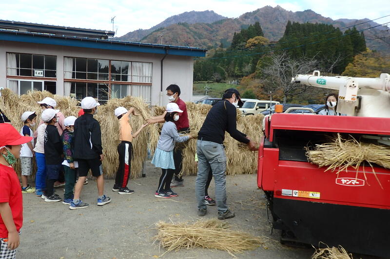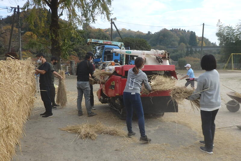 職員も脱穀体験。PTA副会長も手伝いに来てくださいました。