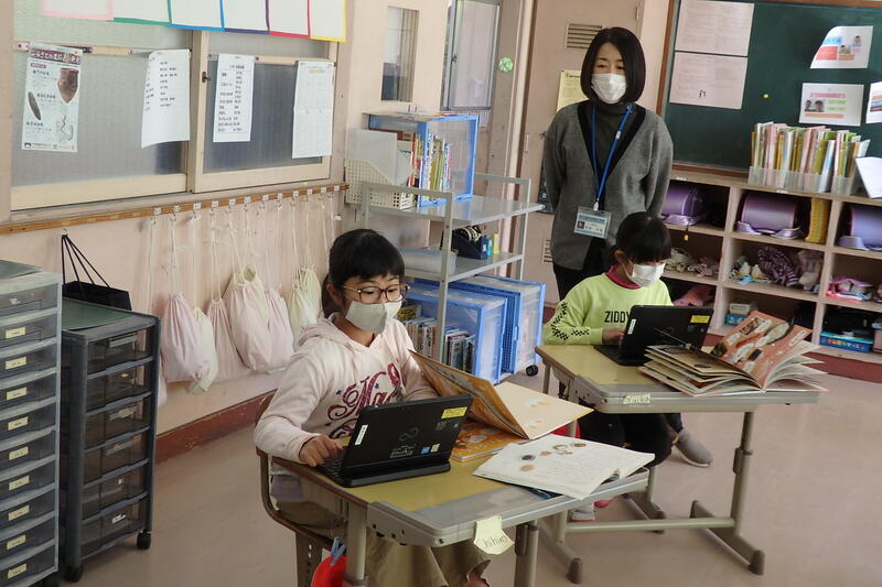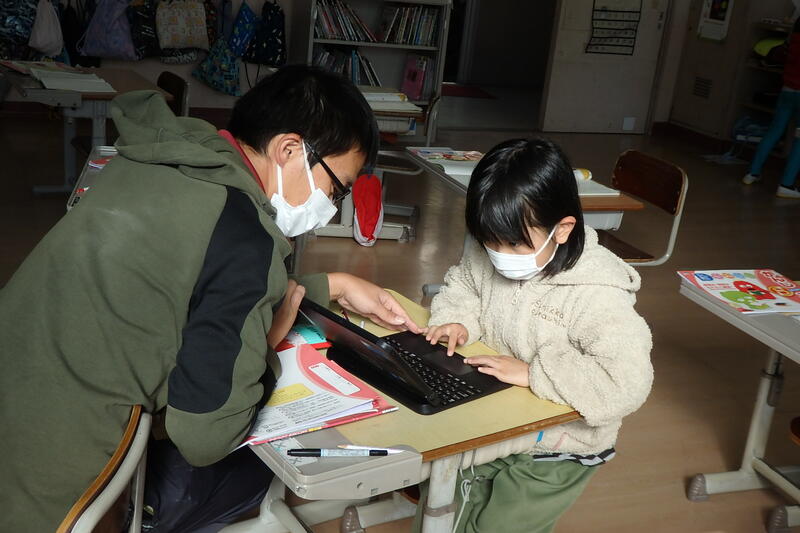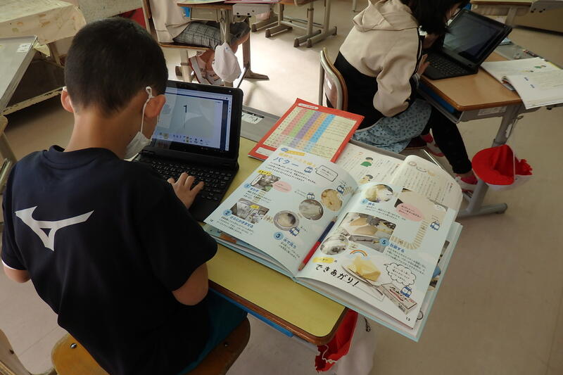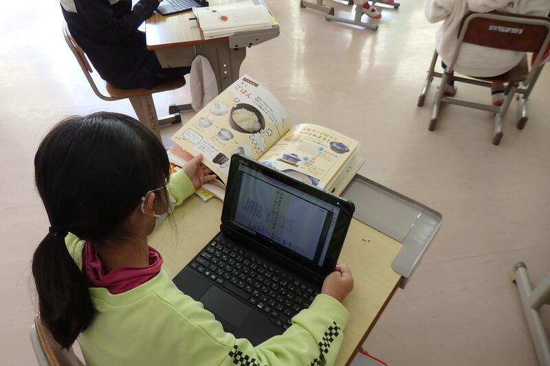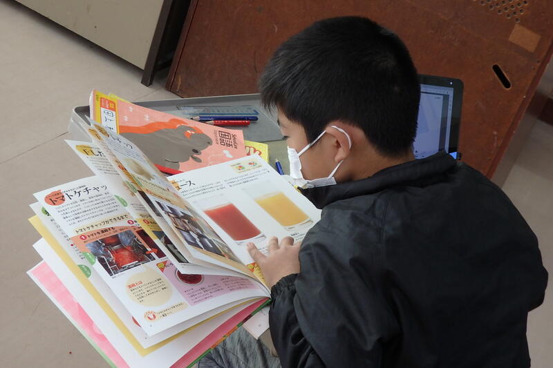 図鑑から読み取ったことをタブレット端末に入力しています。