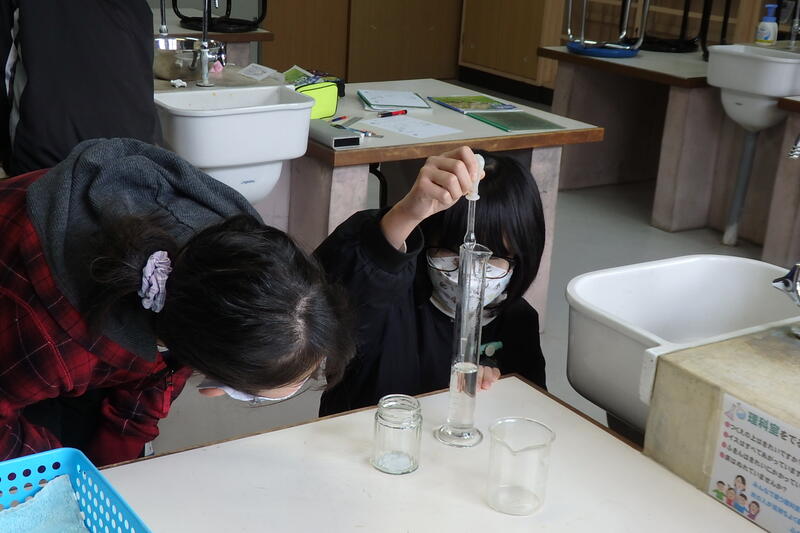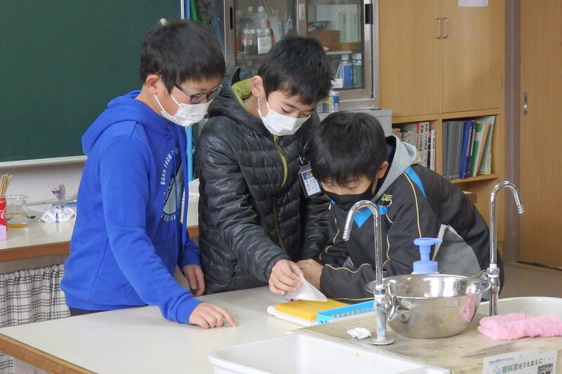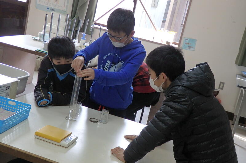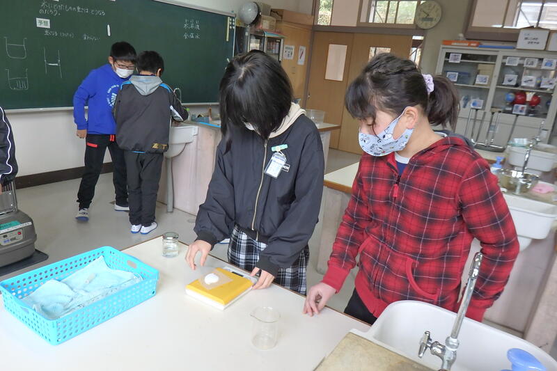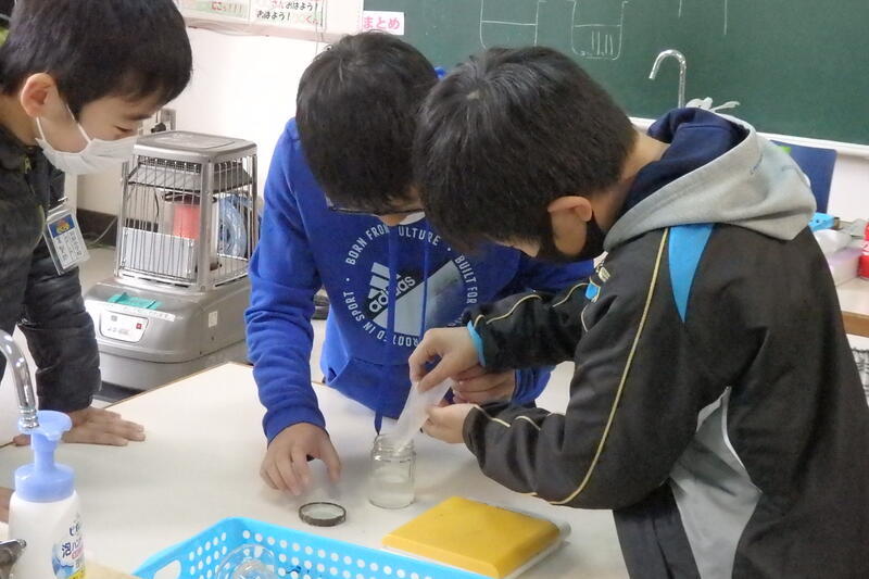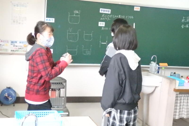 水に食塩を溶かした後の重さはどうなるのか、確かめています。