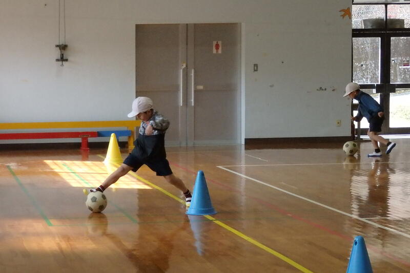 ボールを蹴ることで、体のバランスをとる動きを意識させます。