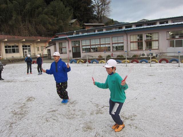 運動場も白一面 しかし子供たちは元気に朝から縄跳びをしていました。