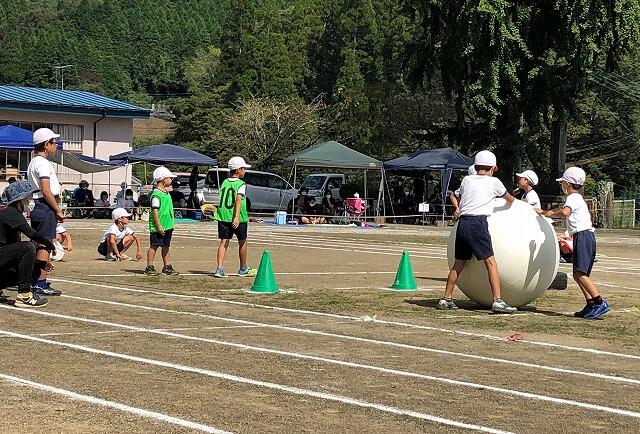 1年生から3年生の団技では、大玉をカラーコーンにぶつけてたおさないと、次の走者に交代できません。
