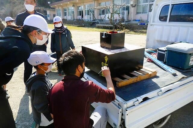 学校の校門下坂の入り口に、新たにたてる「標柱」の土台に6年生の名前を書きました。