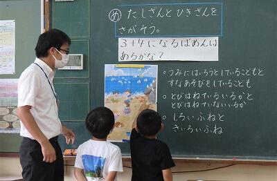 2・3年生は、算数の授業を複式で行っています。学習内容を説明しています。