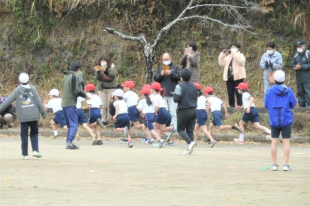 1年生の二人(白帽子)は、2年生に負けない気持ちいっぱいで、走りきりました。